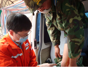 这时,有名小战士陂着脚走过来,怯生生地说“医生,我腿受伤了,麻烦你们看看好吗?”“好,到救护车上来吧,请你把长裤脱了,”军医出身是吴鸿医生一边说着,一边带上了消毒的橡胶手套,这时,李护士已经将消毒药品都准备好了,小战士羞涩的看了看李护士,说了一声,还是算了,谢谢啊,转背就融入那一群绿军装中。吴医生和尚院长愣了一下,不约而同的说了一句,不行,赶紧找他回来,伤口感染了可不行。随后,我们一行找到了正在抢险的团队领导,说明来意,并保证将受伤的小战士包扎好后送回来,团长随口喊来一个中尉,交代了两句,不久,受伤的小战士和陪同战友,又回到我们车上,吴医生赶紧说:“小兄弟,我们都是部队出来的,治伤没关系,不要害羞,何况你只是脱掉外裤”,小战士腼腆的笑了笑,说:“我不是害羞,是因为抢险救灾以来,几天都没洗澡,担心身上有气味,让女护士不好意思呢。”随着慢慢的退去了长裤,一条长约12厘米的伤口,透着鲜红的肉色呈现在我们眼前,车上的人沉默了一会儿,吴医生问了一句,是什么东西划伤的?钢筋,我们在搬动一块预制板时,一条伸出的钢筋从大腿上划了一下,当时也没觉着痛,后来战友们说裤子上湿了一块,我一看裤子划破了才感觉到痛。吴医生哦了一声,手也没停着,棉签先后沾着双氧水,络合碘,清洗着伤口,消毒,“痛就说啊”,“不痛,噢,能忍住的,一下就好吧,我们班今天的任务重,少了两个人,他们可能完不成”,随后望了一眼陪同来的战友。