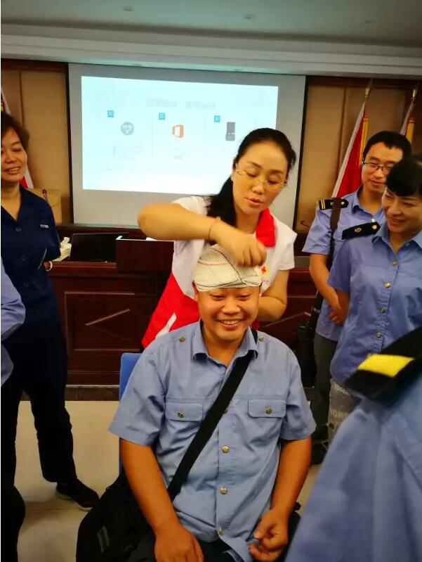 老师在讲解头部出血包扎技术开班典礼结束后,市红十字医院的救护培训师资们组织学员们开始了紧张的学习,两天的时间里系统地学习了红十字基本知识,常见急症的急救处理方法以及止血、包扎、搬运和心肺复苏四大急救技术??翁蒙洗蠹胰险嫣巫霰始?,积极操练,互帮互助,学习氛围浓厚,学员们纷纷表示掌握急救技能是救人救己的好事,要将所学知识宣传给身边的亲人、朋友,广泛普及应急避险知识。在6日下午的理论和实操考试中,学员考试全部合格顺利结业,均获得了市红十字会颁发的红十字救护员证书。