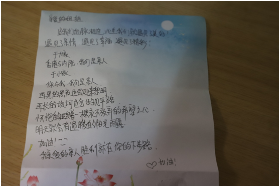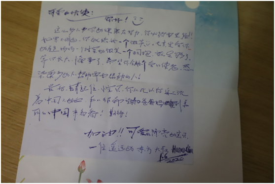 叶勇(化名)是一名卫生疾控工作人员,来自于医学世家,祖孙三代都是学医的,叶先生的孩子目前在湘雅医院临床实习,也是一名准医务人员。今年已是他专门从事健康知识教育科普工作20年,作为一名健身爱好者,多次参加团体自行车赛并屡屡获奖。据他回忆,十年前在献血时获取了捐献造血干细胞的信息,“当时我和同事们一起参加单位组织的献血活动,工作人员向我介绍捐献造血干细胞。当时也没多想,觉得能救人就是很有价值的事,于是加入了中华骨髓库?!痹谀侵?,他又每年坚持参加献血活动?!霸诮拥胶鲜『焓只岬耐ㄖ弥矣朐对谕蚶镏獾挠⒐锥匦∨笥雅湫统晒?,问我是否愿意捐献造血干细胞时,我毅然答应了,觉得这真是一种奇妙缘分,但是我老婆和孩子考虑到我的健康问题显然不愿意,而我正好是做健康教育工作的,经过一番沟通,他们最终支持我的决定。”采集结束时,叶志勇拿出自己亲笔写的一封信,嘱托取干志愿者带去英国伦敦,表达自己对孩子的期望和祝福。这封信将承载着无私大爱漂洋过海,点燃素不相识的异国小孩的生命希望。