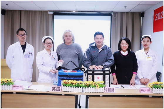 采集结束后,湖南省红十字会骨髓库张赞主任、中南大学湘雅二医院血液科邓明扬教授、袁睆护士长以及英国、香港接送造血干细胞的志愿者进行了交接仪式。两份沉甸甸的“生命种子”将带着我们的希望以最快的速度送往患者目的地,注入到他们体内使其重生。