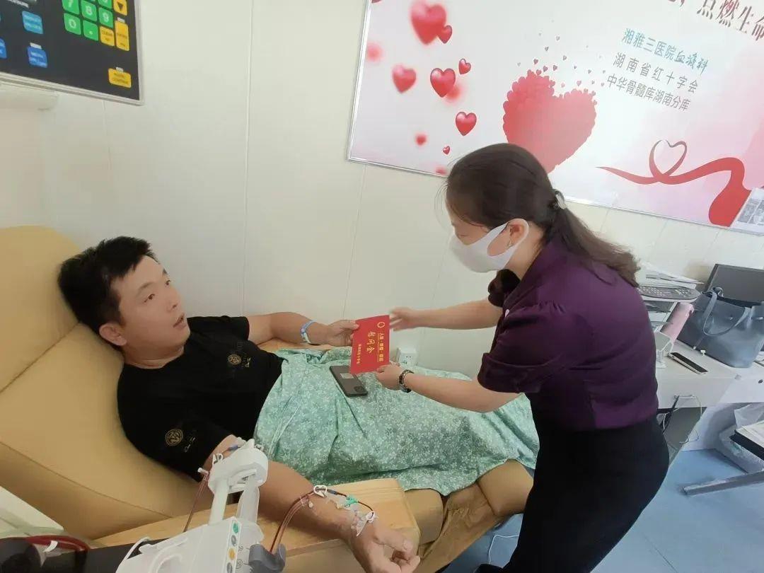 “谢谢你给我一次重生的机会,康复后我也会像你一样将爱传递下去?!?月20日上午,在中南大学湘雅三医院血液科造血干细胞采集室,毛敏听到患者写的感谢信,腼腆地笑了。1979年出生的毛敏是益阳市强制隔离戒毒所三大队副大队长。2009年,在家人的鼓励下,他开始献血?!拔乙郧案芏嗳艘谎P南籽杏跋?,了解后才明白,这是一件有意义的事情”。
