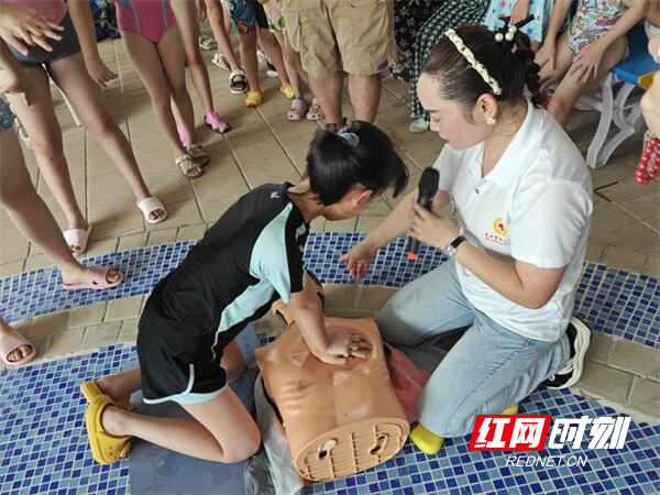 活动中,市红十字会专家谭精华、彭慧就防溺水自救互救理论知识与实践、心肺复苏实操演练等内容对来自周边社区的100多名小朋友及家长进行公益宣教。湖南省女子水球队优秀运动员黄嘉钰、何琛、潘粒等也积极加入公益宣教活动中,践行省体育局运动队(员)进学校、社区开展健身指导服务工作要求,在水中指导小朋友简单的游泳技能、溺水自救的实用办法。