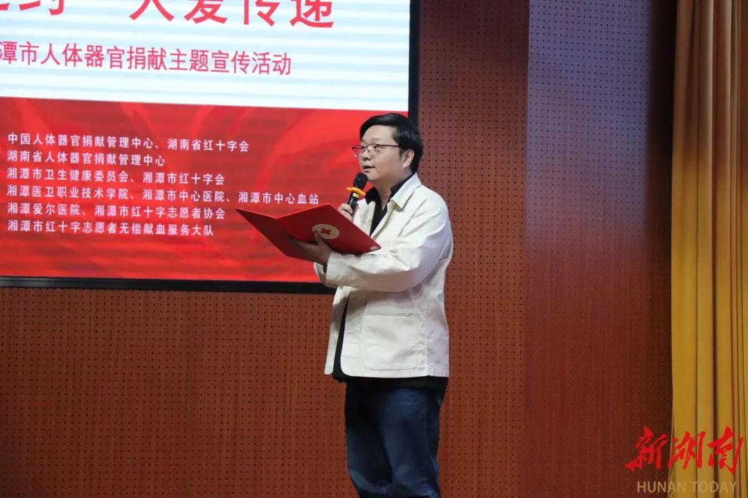 10月23日上午,由湖南省人体器官捐献管理中心主办,湘潭市红十字会承办的“生命之约·大爱传递”2023年湘潭市人体器官捐献主题宣传活动在湘潭医卫职院报告厅拉开帷幕,向广大市民发起人体器官捐献志愿登记倡议。